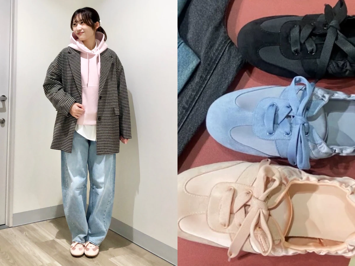 在正式開賣前,日本 GU 店員已率先示範抓褶芭蕾運動鞋的多種穿搭可能。薄底運動鞋輪廓非常適合搭配寬褲,營造俐落又帶點慵懶的街頭感;若是搭配短裙或迷你裙,加入白襪能自然拉長腿部比例,呼應今年秋冬持續流行的學院運動混搭風。單穿時腳感看起來也相當輕盈,外國模特兒以緊身褲直接搭配,較淺的鞋口設計讓腿部線條更顯修長。全系列共推出黑、灰、粉、藍四色,百搭度極高;若想為秋冬造型增添亮點,編輯私心推薦粉色款,柔和卻不失存在感。