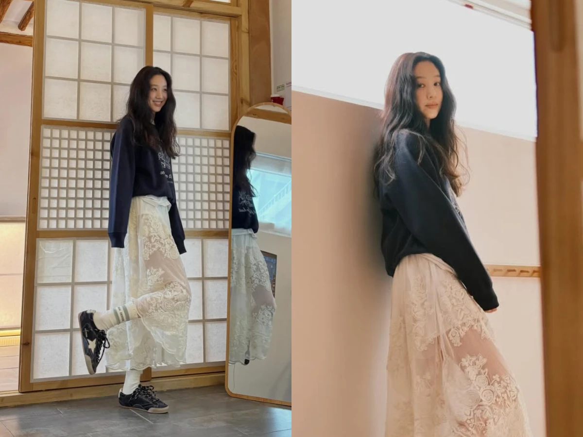 鄭麗媛以藍色大學T作為主軸,內搭白色高領上衣,領口微微露出,增加層次感與清新氣息,下身選擇一件透膚蕾絲長裙,細緻刺繡圖騰在光線下若隱若現,營造出浪漫又帶點法式優雅的氣質。她巧妙以白色長襪銜接球鞋與裙襬,不僅拉長腿部比例,也讓整體造型多了一點少女感與休閒氣息,看似隨性卻細節滿分,不愧是韓妞們的穿搭範本之一!