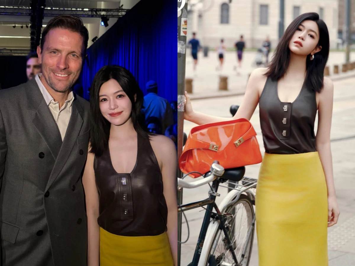 此次看秀造型,陳妍希選擇棕色皮革銀釦背心,搭配芥末黃短裙,色彩組合鮮明卻不失優雅層次,大U領的背心的金屬扣件呼應品牌經典細節,俐落剪裁展現自信線條,她手拎橘色 Hug 包款,為整體造型注入亮點,在義式優雅輪廓中融入大膽色彩,既保留 Ferragamo 一貫的低調奢華,也透過色調碰撞展現個人風格。