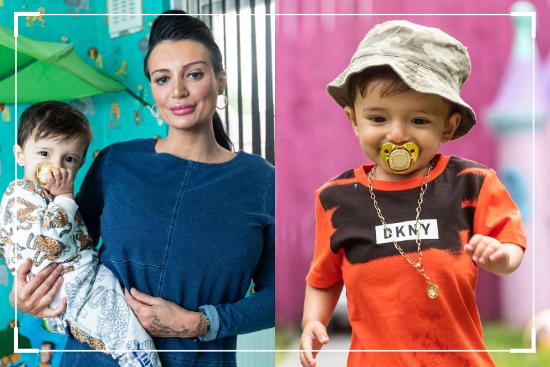Kasey不僅替年僅1歲的兒子購入各大名牌衣物、鞋子,甚至連飾品,也不忘戴上名貴的Versace項鍊、鑽石手鏈,最令人驚呼的是,連奶嘴也要是價值近1,000英鎊(約新台幣3萬元)的純金Versace奶嘴!